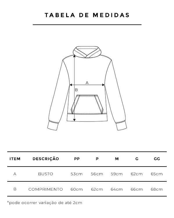 Os números da tabela equivalem às medidas da peça esticada em uma superfície plana e pode ocorrer variação de até 1,5cm para mais ou para menos entre uma peça e outra. Para escolher o melhor tamanho e com mais confiança, sugerimos que você meça uma peça de roupa sua parecida. Se ainda estiver com dúvidas, chame a gente no whatsapp clicando no botão verde no canto inferior direito do site.